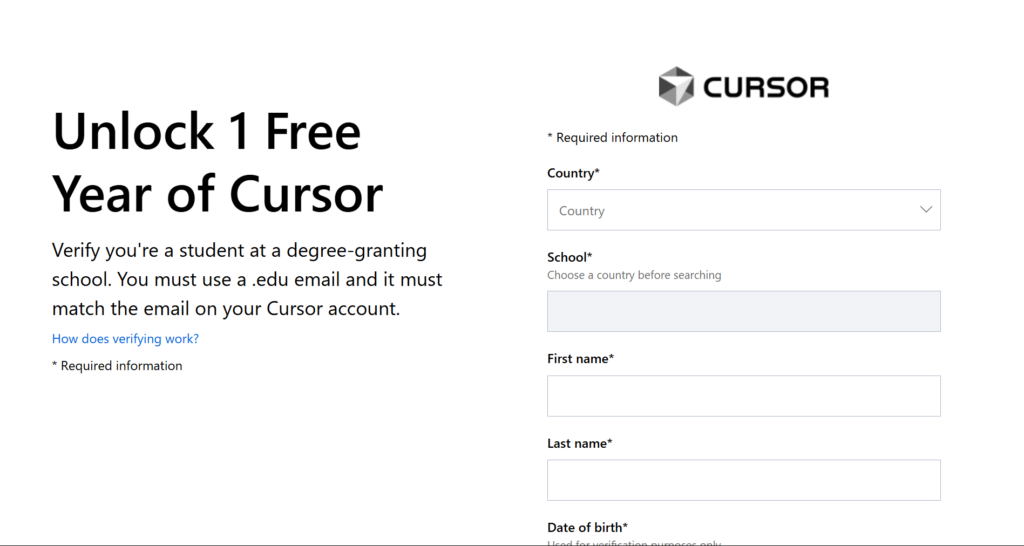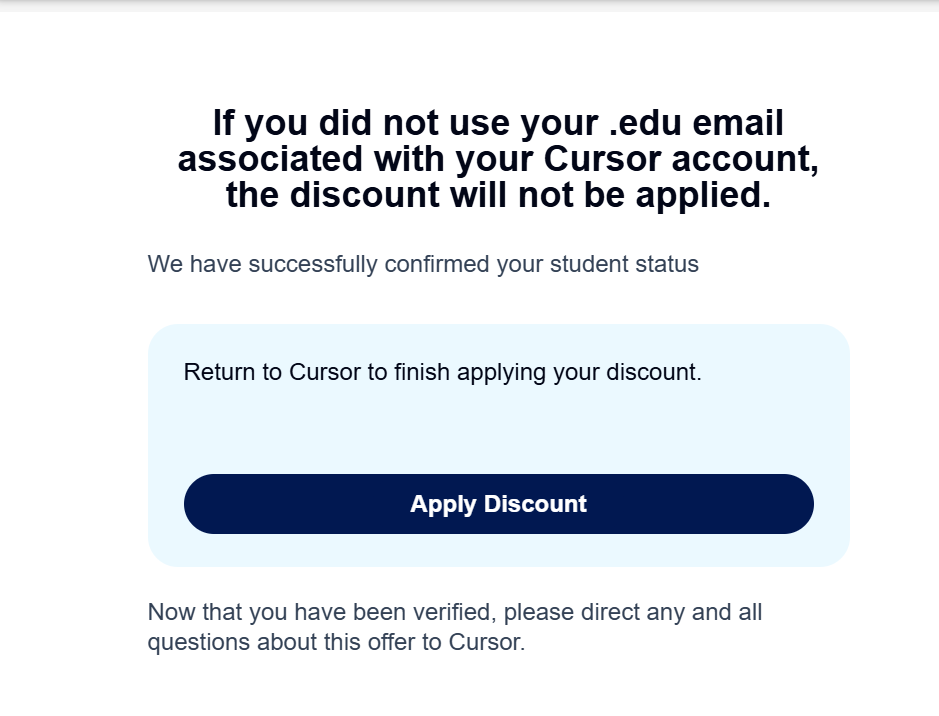 これはおそらく、Cursor本体の機能というよりは連携した学生アカウントのチェックサービスじゃないかな。ここまでは、突破できたと思う。