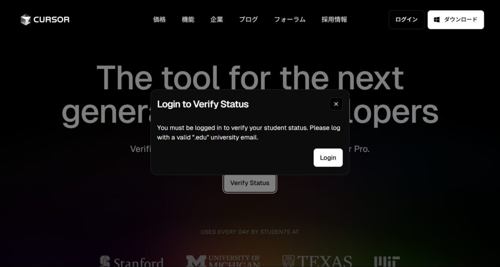“You must be logged in to verify your student status. Please log with a valid “.edu” university email.”(学生ステータスを確認するにはログインする必要があります。有効な「.edu」形式の大学メールアドレスでログインしてください。)