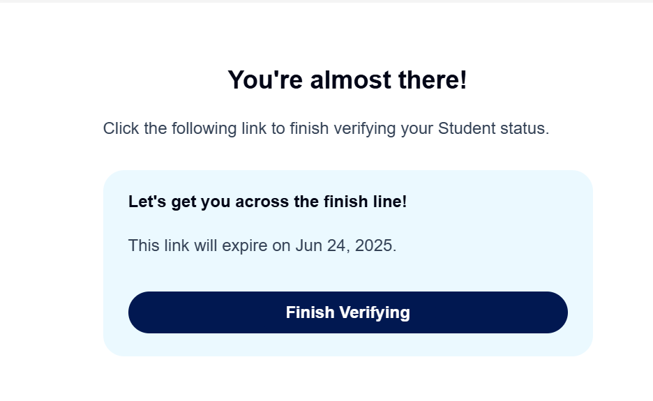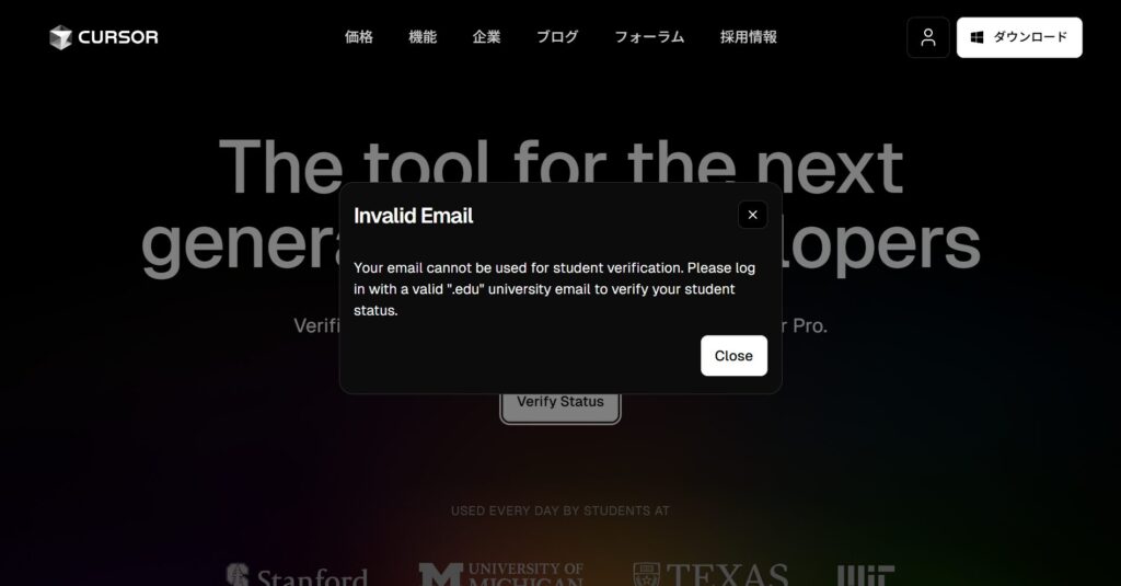 “Your email cannot be used for student verification. Please log in with a valid “.edu” university email to verify your student status. ” (あなたのメールアドレスは学生認証には使用できません。有効な「.edu」形式の大学メールアドレスでログインし、学生としてのステータスを確認してください。)