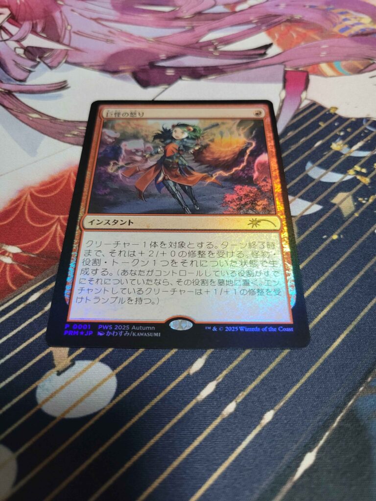 《巨怪の怒り》。プロモが発表されたときにはスタンダードで禁止を喰らっていたある意味ネタカード。しかし、イラストが可愛いからヨシ! 正直もうこのまま帰ったって良かった。